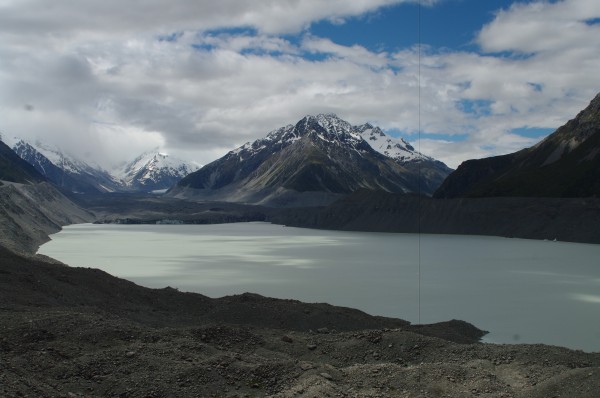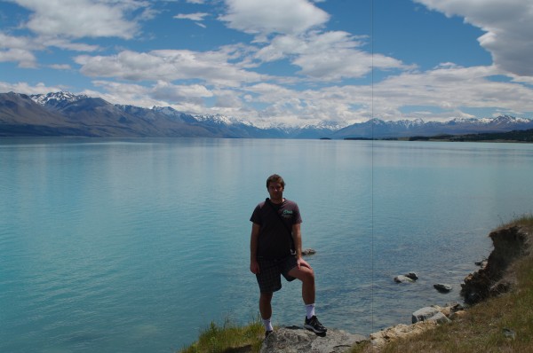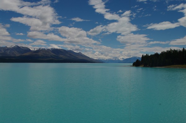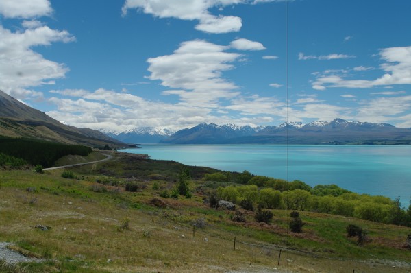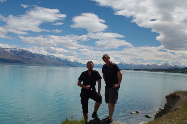 Podstatne zajimavejsi panoramata jsme si ale doprali den na to. Prejezd pres Lake Tekapo a Mt. Cook smerem do Dunedinu je podle me rozhodne jedna z tech nejhezcich veci, co muze NZ nabidnout – jeste ke vsemu kdyz vyjde pocasi. Na fotkach to sice tolik nevyzni, ale neskutecne modra jezera se zasnezenymi horami v pozadi tvori vskutku nezapomenutelny vyhled. Roman si dopral osvezujici koupel, my obeznejsi jsme z obav pred vsudypritomnymi fotaky maximalne brodili.) Kazdopadne spaleni jsme ke konci byli kupodivu vsichni, coz moc nechapu, kdyz bych mel byt vicemene mistni.)